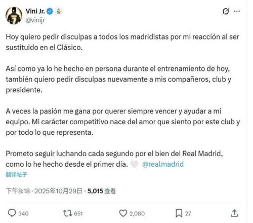 北京时间10月29日,皇马球星维尼修斯在社媒发文,就国家德比不满被换下的争议行为,向皇马球迷、队友、俱乐部和主席致歉。