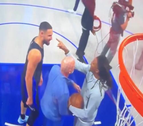 随后,汤普森命中了一个三分球,伸手指了一下热火队替补席的加德纳,热火队的维金斯赶紧按住了加德纳,要他别再说了。赛后,热火队的助理教练、前小牛队夺冠功臣卡龙-巴特勒拉着加德纳上前,去跟汤普森道歉,这个事情才算结束。