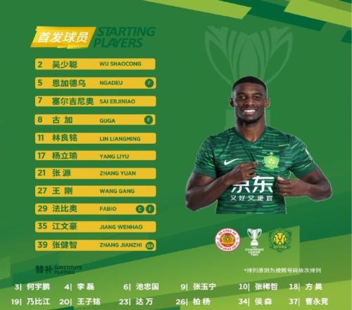 替补:34-侯森、3-何宇鹏、4-李磊、19-乃比江-莫合买提、26-柏杨、6-池忠国、10-张稀哲、23-达万(F)、37-曹永竞、9-张玉宁、18-方昊、20-王子铭
