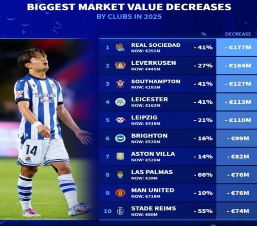 2025年已经结束,《转会市场》也统计了年度球队身价贬值榜,皇社、药厂分列前二。2025球队身价贬值榜:欧元