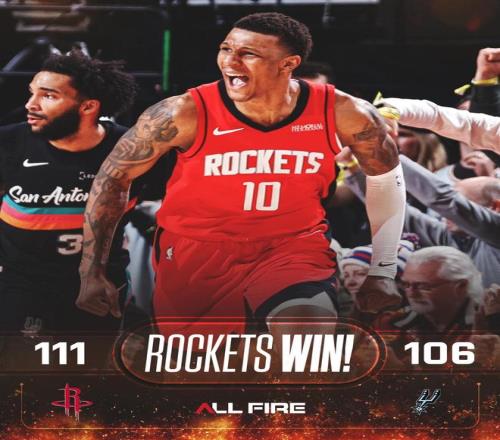 文班亚马、卡斯尔相继远投打铁,距离终场仅剩14秒,乌度卡请求暂停。谢泼德2罚1中,米奇约翰逊请求暂停。文班亚马三分球不中,阿门2罚全中,卡斯尔外线打铁,文班亚马补扣,比赛时间走完。最终,火箭以111比106险胜马刺,上演了16分大逆转好戏。马刺末节3分球13中0,单节得分以14比29落后,惨遭休斯顿翻盘。