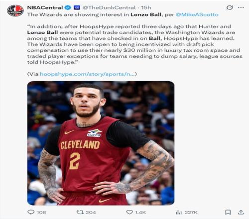 根据NBA记者迈克尔-施密特的报道,魔术队对朗佐鲍尔感兴趣,奇才队也在考察鲍尔,奇才队愿意用选秀权补偿作为激励条件,而且奇才队有3000万的奢侈税空间,奇才可以用交易特例来帮助骑士减轻奢侈税重罚。